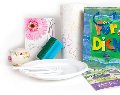 Eine Vielzahl an Geschenkartikeln, Verpackungmaterial (z.B. Papier- u. Plastiktüten, Packpapier, Krapfentüten, Cellophanbeutel, Schnappbeutel) und alles rund um "Feste und Feiern" (z.B. Trinkbecher, Pappteller und Servietten) sowie Verbrauchsartikel wie z.B. Papierhandtücher, Toilettenpapier und Küchenrollen runden unser umfangreiches Angebot ab...